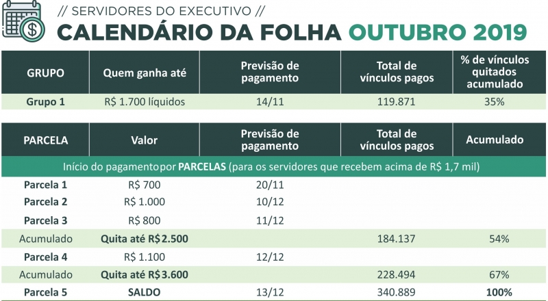 Dia 14 do próximo mês recebem servidores com vencimento líquido até R$ 1.700,00, que representam 35% dos vínculos do Executivo. Valores acima desse patamar entrará no sistema de parcelas. O primeiro depósito do parcelamento será de R$ 700,00 em 20 de novembro.
