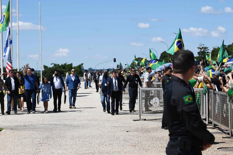 O presidente Jair Bolsonaro mais uma vez prestigiou, ontem, pessoalmente uma manifestação em Brasília de apoiadores a ele e com críticas ao Supremo Tribunal Federal (STF) e ao Congresso Nacional. Desta vez, o ex-ministro Sérgio Moro também foi alvo do protesto. Em declaração transmitida em live dele em rede social, Bolsonaro afirmou: "Tenho certeza de uma coisa, nós temos o povo ao nosso lado, nós temos as Forças Armadas ao lado do povo, pela lei, pela ordem, pela democracia, e pela liberdade. E o mais importante, temos Deus conosco". Bolsonaro foi até a rampa do Planalto para acenar aos manifestantes, aglomerados, que gritavam "Fora Maia", entre outras coisas. O presidente voltou a atacar governadores por medidas de isolamento social no combate ao coronavírus e criticou o que chamou de "interferência" em seu governo, numa alusão às recentes medidas do STF.