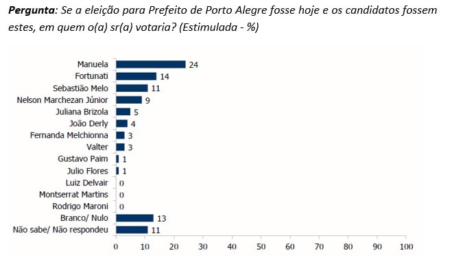 Juliana Brizola (PDT), com 4%, Fernanda Melchionna (PSOL) e Valter Nagelstein (PSD), com 3% cada, e Gustavo Paim (PP), com 2%, completam a lista. Os outros candidatos somaram, no máximo, 1% das intenções de voto. Neste cenário, brancos e nulos chegam a 15%, e 18% não sabem ou não responderam.