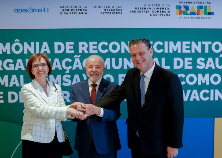 Na visita oficial à França, o presidente da República, Luiz Inácio Lula da Silva (PT), e o ministro da Agricultura, Carlos Fávaro, participaram nesta sexta-feira (6), em Paris, da cerimônia de entrega do certificado que confere ao Brasil status de país livre de febre aftosa, sem vacinação, conferido pela OMSA (Organização Mundial de Saúde Animal).