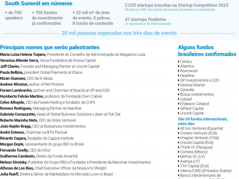 As expectativas para o South Summit Brazil 2023 crescem nesta reta final para o evento. Os números da segunda edição proporcionam uma ideia da importância da feira que tem entre as finalistas startups de 16 países, palestrantes de renome nacional e internacional e mais de 100 fundos de investimento, sendo 34 deles internacionais.