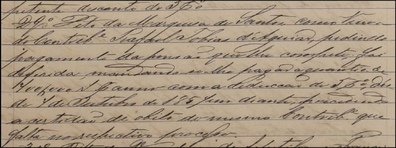 Um dos trechos diz: "A Marquesa de Santos como viúva do contribuinte Rafael Tobias D'Aguiar, pedindo pagamento da pensão que lhe compete. Foi deferida, mandando-se-lhe pagar as quantias de 700$000 por ano com a dedução de 5% desde 7 de outubro de 1857 em diante, precedendo a certidão de óbito do Mesmo contribuinte que falta no respectivo processo".