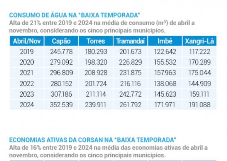 Números da Corsan podem ilustrar com propriedade a presença de mais pessoas no Litoral o ano inteiro. Um recorte sobre os cinco principais municípios demostra forte crescimento em unidades ativas e no consumo de água no período identificado como “baixa temporada” (abril a novembro). Considerando Capão da Canoa, Tramandaí, Imbé, Torres e Xangri-lá, de 2019 a 2024, houve aumento médio de 16% no número de unidades ativas. Com relação ao consumo, o acréscimo médio chega a 21%. Isoladamente, Capão aumentou o consumo de água na baixa temporada em aproximadamente 43%.