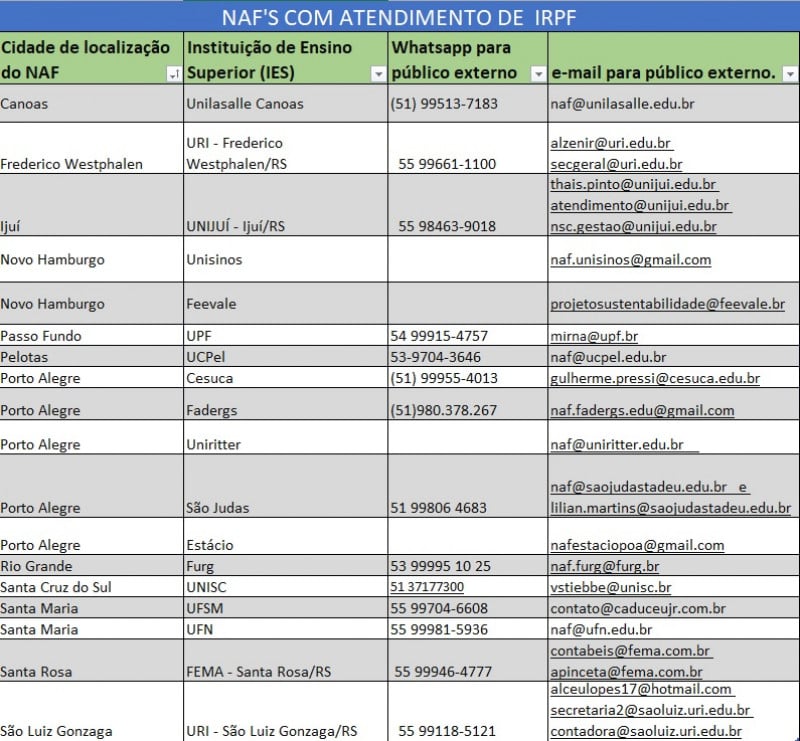 Os Núcleos de Apoio Contábil e Fiscal (NAF’s), projeto desenvolvido pela Receita Federal com as instituições de Ensino Superior, oferece serviços contábeis gratuitos a pessoas físicas e jurídicas de menor poder aquisitivo para o preenchimento da Declaração do Imposto de Renda. São mais de 300 NAF’s formalizados no Brasil, e cerca de 18 no Rio Grande do Sul (confira a relação na tabela abaixo).