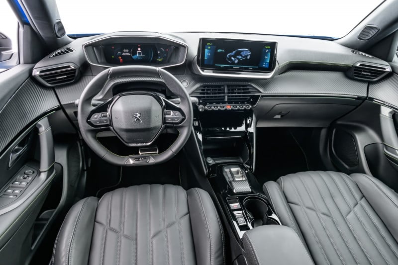 O visual arrojado do exterior do Peugeot e-2008 se repete na cabine, onde a atração é o conceito i-Cockpit 3D, que inclui o volante esportivo rebaixado, a central multimídia com tela de 10 polegadas e o quadro de instrumentos 3D levemente elevado. Destaque também para os botões de controle que lembram interruptores de painéis de aviões a jato.