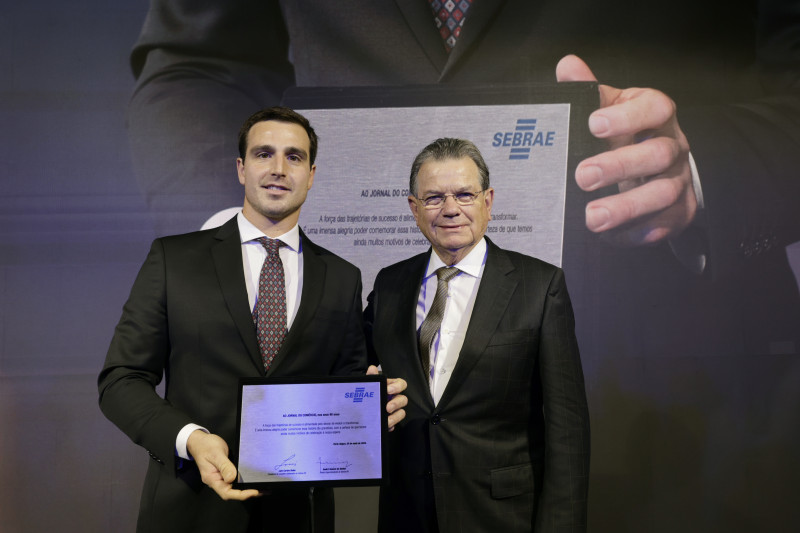 Além de discursos sobre o Dia da Indústria e o prêmio Destaques do Ano, realizado pelo JC, o evento realizado nesta quinta-feira na Fiergs também teve uma homenagem do Sebrae-RS aos 90 anos de circulação ininterrupta do Jornal do Comércio. A distinção foi entregue pelo presidente do Conselho Deliberativo do Sebrae-RS, Luiz Carlos Bohn, que também preside a Fecomércio-RS. Giovanni Jarros Tumelero, diretor de Operações do JC, recebeu a honraria.
