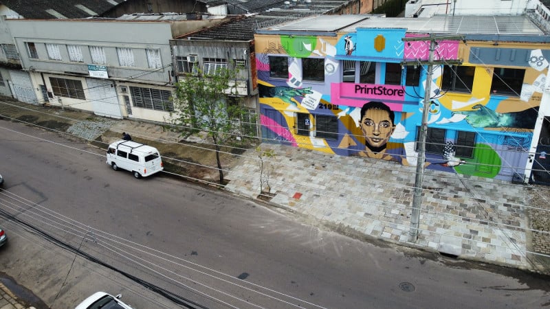 A rua Câncio Gomes, no bairro Floresta ganhou novas cores com uma pintura do artista gaúcho Renam Canzi, de Garibaldi, que assina mais de 100 murais em diversas capitais. Faz parte das comemorações dos 30 anos da indústria gráfica gaúcha PrintStore. Um presente para quem circula por esta região de Porto Alegre, que é predominantemente cinza.