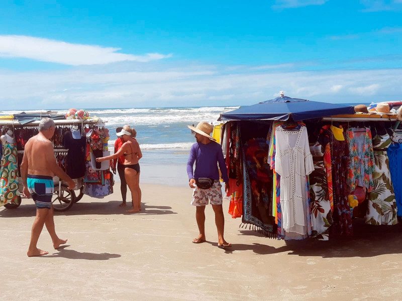No início, eram camelôs que carregavam peças de roupa de praia em cabides. Nos anos seguintes, os cabides foram dando lugar para araras- primeiro fixas, depois móveis como estas. O comércio informal disputa espaço na areia com toda sorte de produtos, da água de coco ao milho verde passando por lanches e até churrasquinho,