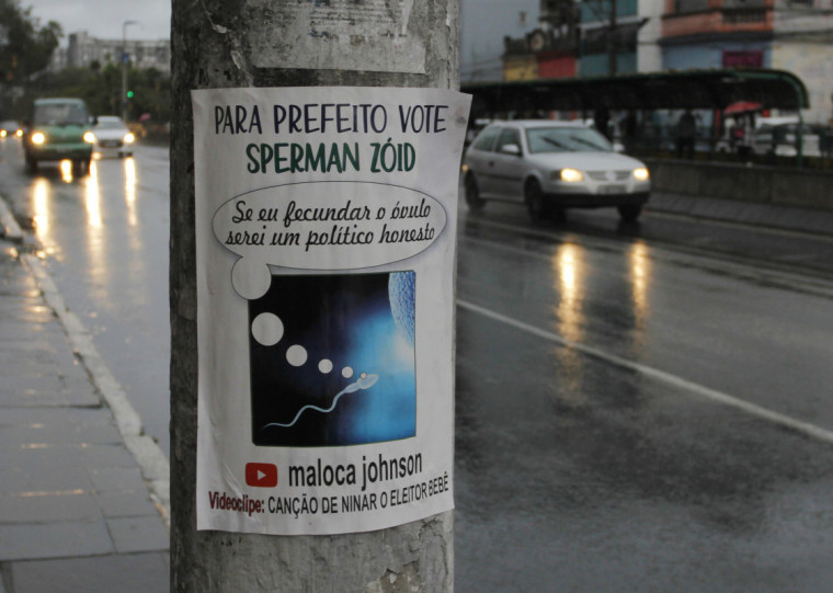 Em cada eleição vem alguma graçola em sugerir candidatos. Nos anos 1960, foi o rinoceronte, bastante votado no Rio de Janeiro. Candidatos de partidos nanicos como Enéas, com seus 15 segundos no horário eleitoral, até que foi bem, fez mais votos que Leonel Brizola. Agora vem o pai de todos, nas mais diversas grafias, incluindo o clássico "Esperma matou o Zóide". Em poste da avenida João Pessoa, em Porto Alegre, espetaram esta versão.