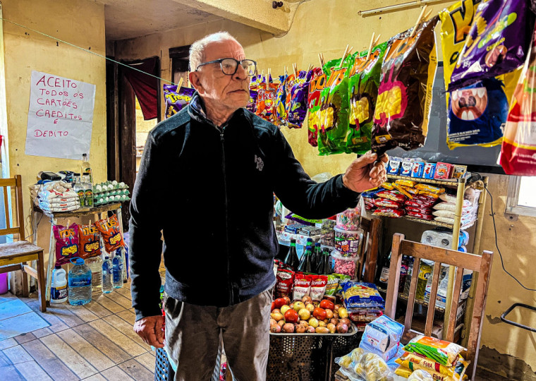 Paulo Ricardo Borges Fernandes, de 74 anos, residente no bairro Rio Branco, em Canoas, mantém há 10 anos um armazém variado em seu apartamento, no andar térreo do edifício, onde atende pessoalmente os mais de 2,5 mil moradores do condomínio. "Fui atingido pela enchente, tive prejuízos, mas não vai ser agora que vou desistir ou desanimar. Bola pra frente, a vida segue!", explica com sorriso largo.