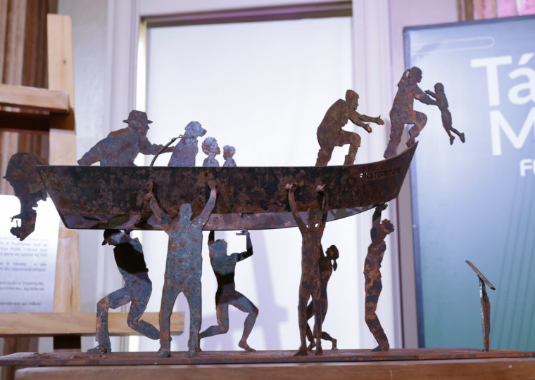 A Federasul e a Associação Comercial de Porto Alegre (ACPA) vão homenagear os brasileiros que, voluntariamente, ajudaram a salvar vidas durante a tragédia climática. A escultura em aço platinado do artista plástico Ricardo Cardoso será em tamanho real (6 metros X 4 metros) e ficará a 1,7 metro, altura da enchente que atingiu o prédio das entidades, o Palácio do Comércio. Parabéns ao autor, é uma bela sacada. Cardoso também dá aulas na Fase RS, ensinando os jovens a trabalhar com ferro.