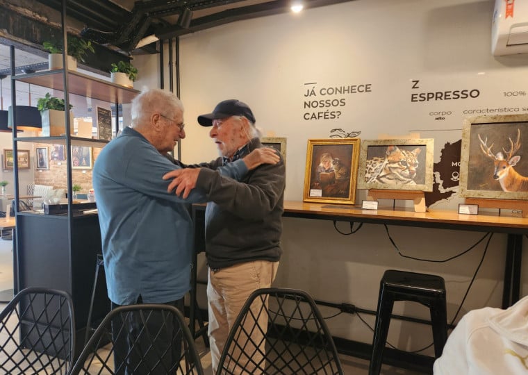Quem entrou todo pimpão na roda do cafezinho dos sábados no Z Café foi o bon vivant Vitório Gheno (d), mais contente que lambari em sanga e tão serelepe quanto um. Gheno completou 101 anos naquele dia, para gáudio dos demais jovens por mais tempo na turma. Quem o abraçou foi o empresário rural Eduardo Macedo Linhares, com 94 anos. Na próxima encarnação vou jogar golfe e pintar quadros para chegar aos 101.