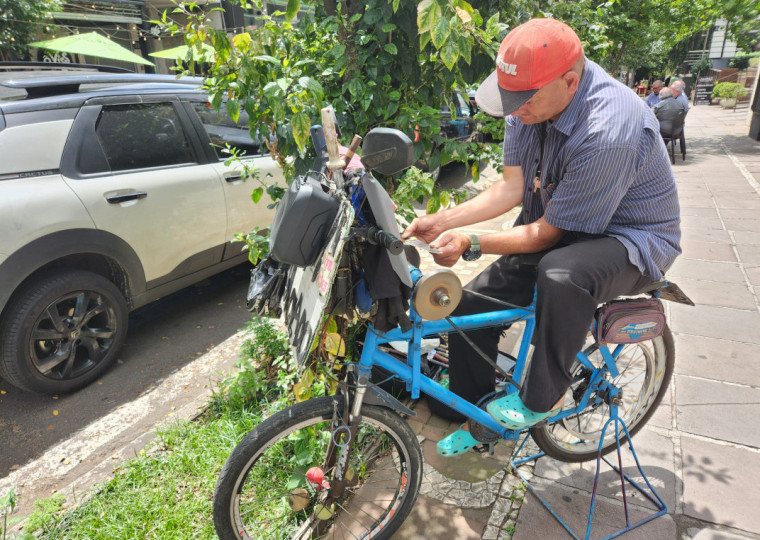 Outrora figura comum nas ruas das cidades anunciando sua presença tocando uma flauta de Pan, feita de taquaras, o afiador de facas e outros instrumentos cortantes meio que tomou chá de sumiço quando estes utensílios caseiros ficaram baratos. Vez que outra aparece um para dar o ar da sua graça, como este na rua Padre Chagas. Freguesia encolheu, mas não desapareceu.