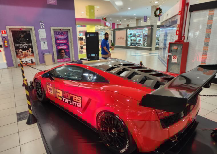 Esta Lamborghini de competição exposta no Shopping Total é uma joia italiana desejo de consumo de quem curte automóveis. O modelo "civil" custa em torno de R$ 6 milhões (boa parte são impostos). Se queres um, entra na fila agora e espera até 2026 para ser o primeiro na fila.