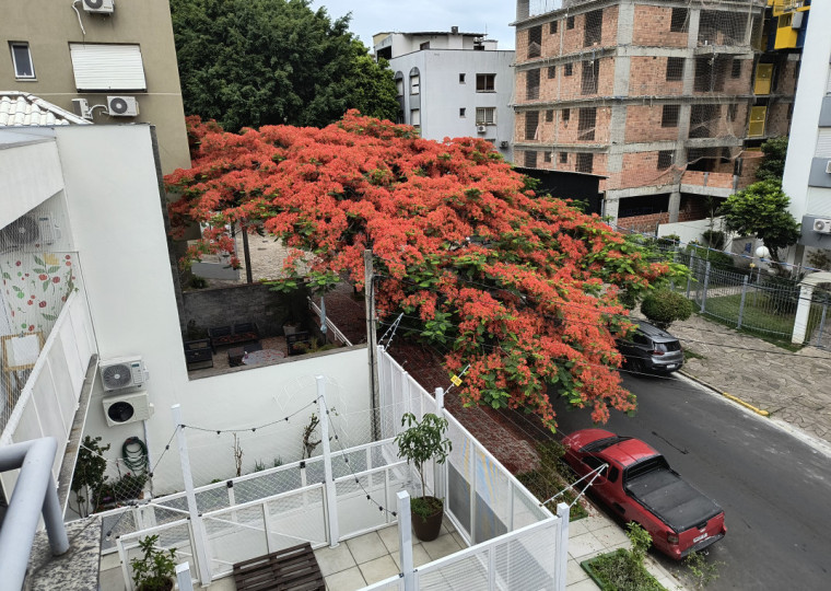 Morador do bairro Petrópolis envia imagem provando que em tudo na vida sempre há os dois lados. Frente ao prédio onde mora, um edifício de oito andares está em construção. A partir das 6h30min o barulho de caminhões e da gritaria dos operários desperta a região. O que compensa é o visual dos flamboyant, árvore originária da ilha de Madagascar. Por isso, floresce no final da primavera e início do verão.