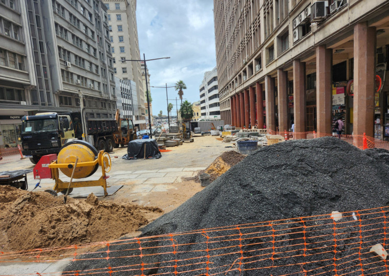 Desde que começaram as obras do Quadrilátero Central do Centro Histórico, o trecho da avenida Borges de Medeiros entre a Andradas e a José Montaury virou um "centro logístico" das empreiteiras. O tapume de metal já foi retirado, o que escondia a parafernália de equipamentos, veículos e material usado na revitalização.