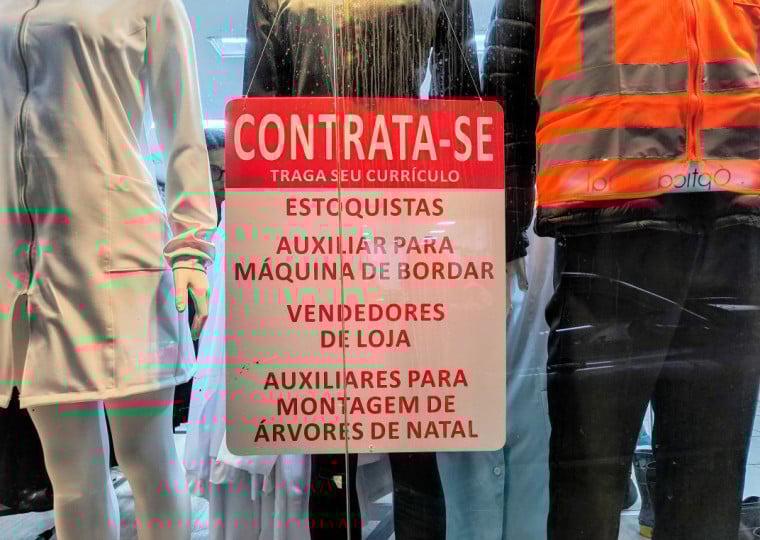 Há quem se queixe da falta de oportunidades de trabalho enquanto os empresários dizem que faltam candidatos para as vagas existentes. Nesta loja da Rua dos Andradas, a gama de vagas ofertadas chama a atenção. Especialmente "auxiliares para montagem de árvores de Natal". Isso que ainda faltam quase quatro meses para a visita do bom velhinho.