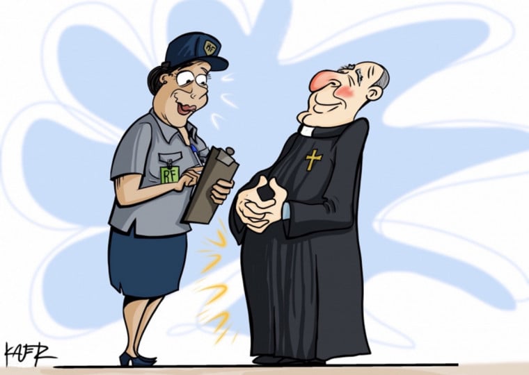 — É que eu comprei um sofisticadíssimo secador de cabelos, muito caro. Ultrapassei os limites das compras e estou preocupada com a Receita Federal. Será que o senhor poderia levar o eletrônico debaixo de sua batina?