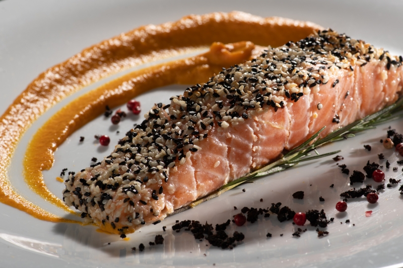 - Temperar salmão com sal, pimenta, azeite e envolver nos gergelins para empanar.