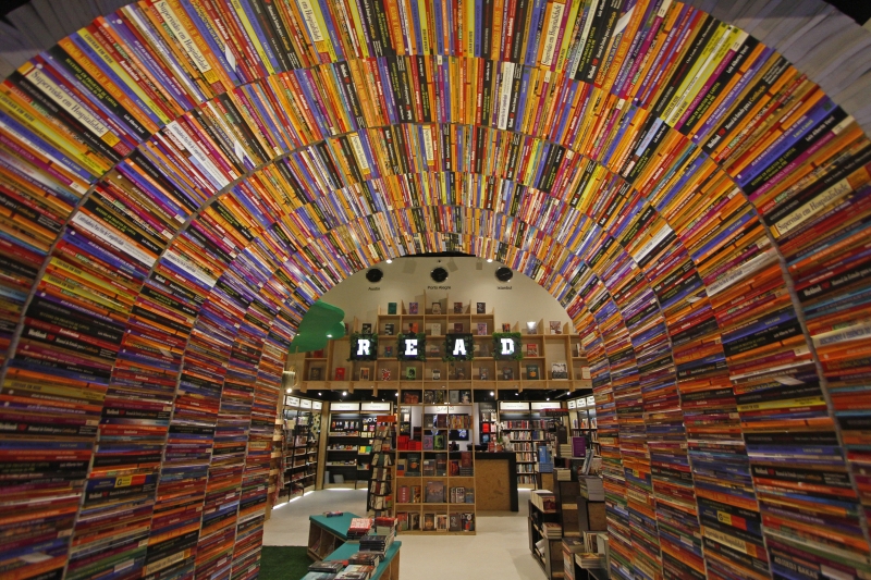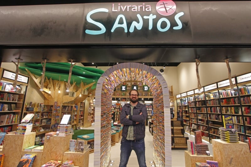 Diante de tudo isso, uma marca registrada do design das lojas ganha sentido. O portal ou túnel de livros na entrada. Ele calcula em mais de 5 mil unidades enfileiradas para formar a recepção.