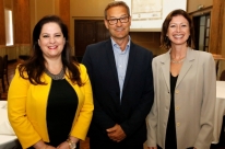Na reunião-almoço, entre Eduardo Logemann e Aurélio Pavinato, a empresária Ingrid Saur, de Panambi