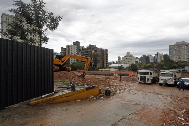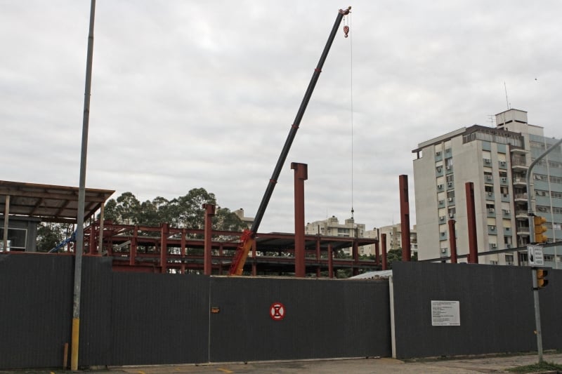 Na avenida Panamericana, no Lindoia, as obras estão sendo feitas. No local, que está cercado, é possível visualizar que uma estrutura metálica está sendo erguida. Uma placa externa ao terreno indica o plantio de mudas para compensar a retirada de vegetação.
