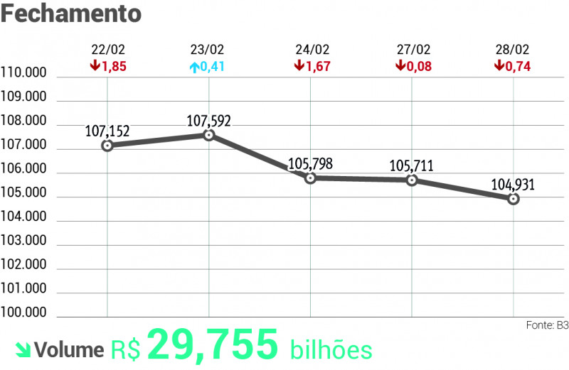 Ao fim, a referência da B3 sinalizava piso da sessão no fechamento, em baixa de 0,74%, aos 104.931,93 pontos, saindo de máxima, mais cedo, aos 106.793,71 e de abertura aos 105.705,79 pontos. O giro, que se mantinha bem moderado como nas últimas sessões, fortaleceu-se no fechamento, aos R$ 29,7 bilhões. Em fevereiro, o Ibovespa teve perda de 7,49%, no que foi seu pior desempenho desde junho passado (-11,50%). Em janeiro, o índice tinha subido 3,37%. No ano, recua agora 4,38%.