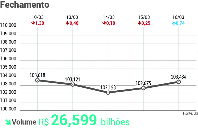 No encerramento desta quinta-feira, a referência da B3, vindo de cinco perdas seguidas, mostrava alta de 0,74%, a 103.434,66 pontos, entre mínima de 102.454,77 e máxima de 103.911,26, saindo de abertura aos 102.682,65 pontos na sessão. Após ter sido reforçado na véspera pelo vencimento de opções sobre o índice, o giro financeiro ficou hoje em R$ 26,6 bilhões. Na semana, o Ibovespa limita perda (-0,18%) no intervalo. No mês, ainda cede 1,43% e, no ano, cai 5,74%.