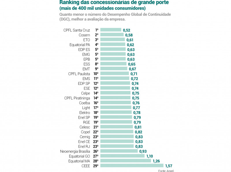 De 29 concessionárias de grande porte no País, que atendem mais de 400 mil unidades consumidoras, a CEEE teve o pior resultado. A companhia registrou um Desempenho Global de Continuidade (DGC) de 1,57 (quanto menor o DGC, melhor a avaliação da empresa), três vezes maior que a melhor colocada, a CPFL Santa Cruz, com 0,52. A mensuração é feita através da média aritmética de outros dois indicadores: Duração Equivalente de Interrupção por Unidade Consumidora (DEC) e Frequência Equivalente de Interrupção por Unidade Consumidora (FEC). O primeiro diz respeito ao tempo que cada unidade consumidora ficou sem energia elétrica e o segundo quanto ao número de interrupções ocorridas no período de observação.