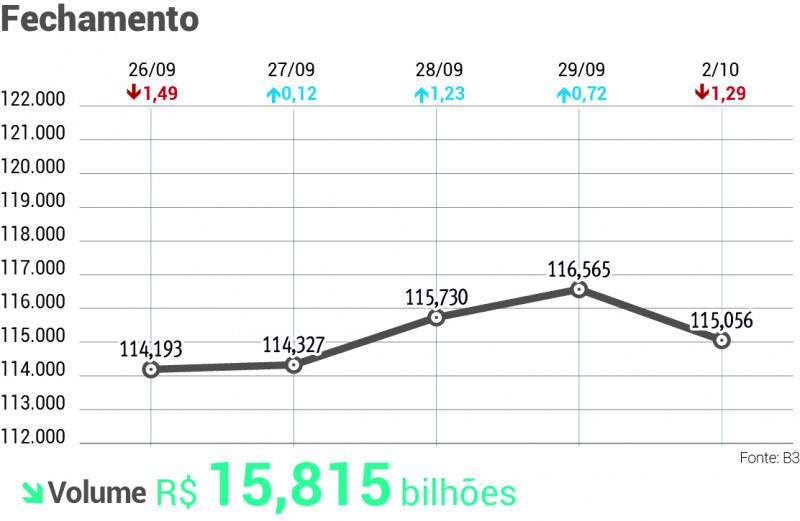 Vindo de três ganhos no fechamento do mês anterior, o Ibovespa iniciou outubro pressionado pela aversão a risco global, que resultou em forte avanço dos rendimentos dos Treasuries nesta abertura de semana. Assim, o índice da B3 encerrou o dia bem mais perto da mínima (114.761,10) do que da máxima (116.672,30) da sessão, saindo de abertura aos 116.565,17 pontos. Ao fim, mostrava queda de 1,29%, a 115.056,86, com giro fraco, a R$ 15,8 bilhões. No ano, o índice sobe 4,85%.