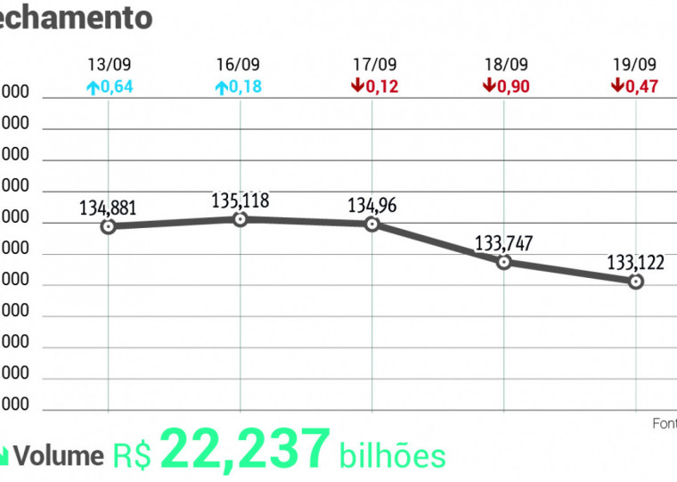 Em dia de dólar em alta após uma longa sequência de apreciação do real, o Ibovespa acentuou perdas ao longo da tarde de sexta-feira e testou a casa dos 130 mil pontos na mínima, 20, em nível não visto no intradia desde 12 de agosto e, no fechamento, desde o dia 9 daquele mesmo mês. Na sexta, o índice da B3 flutuou em faixa mais ampla, dos 130.907,42 aos 133.128,36, saindo de abertura aos 133.120,87 pontos. E fechou aos 131.065,44 pontos, em queda de 1,55%, que colocou a perda da semana a 2,83% e a do mês, até aqui, a 3,63%. Na semana anterior, o Ibovespa havia acumulado leve ganho de 0,23%, após revés de 1,05% no intervalo precedente.