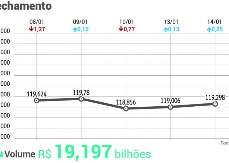 Nesse cabo de guerra entre ações de primeira linha, o Ibovespa fechou como na véspera acima da estabilidade, em alta de 0,25%, aos 119.298,67 pontos na sessão, entre mínima de 118.222,64 e máxima de 119.451,01 na sessão, em que saiu de abertura aos 119.006,60.