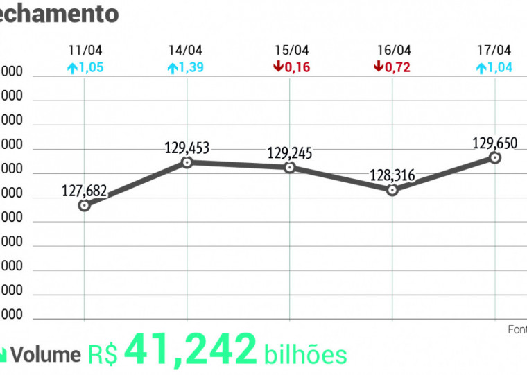 R$ 22,3 bilhões ficou na média diária de negócios. Nesta quinta-feira, o Ibovespa fechou em alta de 1,04%, aos 129.650,03 pontos.