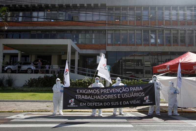 Representantes dos profissionais da área de saúde protestaram na manhã desta quinta-feira (19) contra a falta de equipamentos de proteção individual (EPI) básico nos hospitais de Porto Alegre, como máscaras e luvas. De acordo o Sindicato dos Profissionais de Enfermagem, Técnicos, Duchistas, Massagistas e Empregados em Hospitais e Casas de Saúde do Rio Grande do Sul (Sindisaúde-RS), ao menos 50 denúncias relatando escassez de EPIs foram registras apenas por telefone nesta semana.