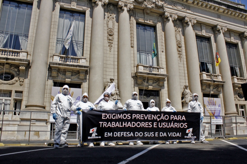 Um grupo liderado pelo Sindicato dos Profissionais de Enfermagem, Técnicos, Duchistas, Massagistas e Empregados em Hospitais e Casas de Saúde do Estado do Rio Grande do Sul (Sindisaúde-RS) protestou em frente ao Palácio Piratini, nesta terça-feira (24), para denunciar a falta de equipamentos de segurança (EPIs) para os profissionais da área de saúde que atuam no atendimento dos pacientes com coronavírus.