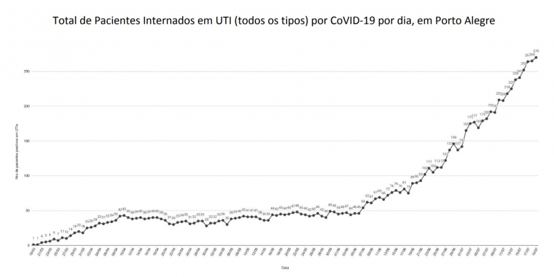 Com a escalada vertiginosa da pandemia, nem o aumento de leitos em UTIs – de 665 em 20 de abril para 756 em 20 de julho – foi suficiente para manter a tranquilidade do cenário. Somente nos 20 dias do mês atual, foram 118 óbitos em razão da Covid-19 em Porto Alegre, número de mortes igual ao ocorrido nos três primeiros meses do novo coronavírus no município. Ou seja, nos últimos 20 dias, a cidade teve a mesma quantidade de mortes pela doença que teve nos 120 dias anteriores.