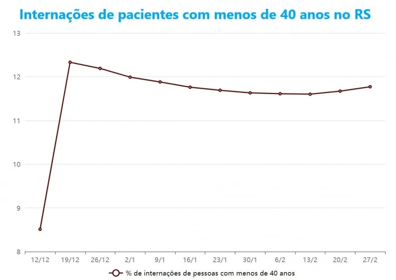 Os percentuais se mantiveram desde meados de dezembro de 2020 até o fim de fevereiro de 2021, data do último boletim epidemiológico divulgado pela Secretaria Estadual da Saúde (SES-RS), quando o índice de pacientes com menos de 40 anos hospitalizados caiu um pouco, ficando em 11,77%, mas a fatia destes que não tinham comorbidades também aumentou registrando 50,69%.