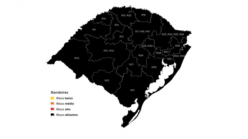Contrariando expectativas de prefeitos e setores da economia, o Rio Grande do Sul segue para mais um período de bandeira preta em todas as 21 regiões do distanciamento controlado. Esta é a nona semana consecutiva nessa condição, que indica risco altíssimo de contaminação pela Covid-19. O mapa da 51ª rodada do modelo, divulgado nesta sexta-feira (23), já é definitivo e tem vigência até o dia 3 de maio.
