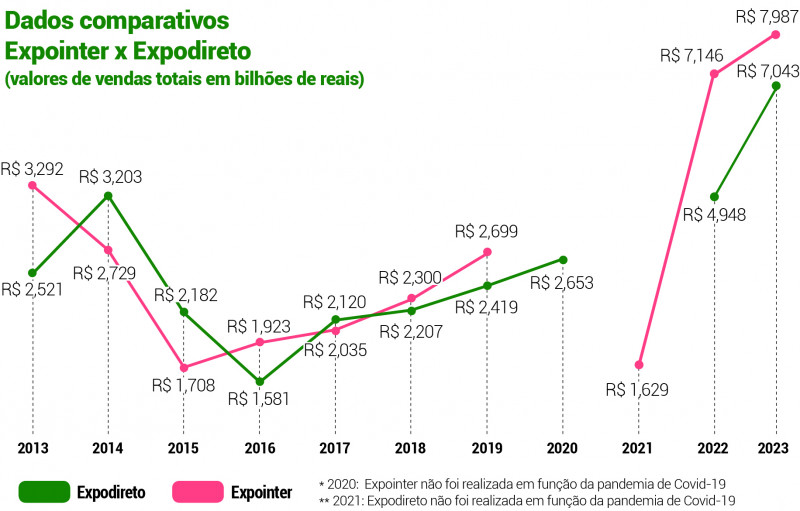 Em 2023, a mostra de Não-Me-Toque comercializou R$ 7,04 bilhões, somando os valores da venda de máquinas e implementos (R$ 6,3 bilhões), agricultura familiar (R$ 2,5 milhões), pavilhão internacional (R$ 114, 9 milhões) e compras à vista (R$ 570 milhões). Já a Expointer, no mesmo ano, faturou R$ 7,98 bilhões, dos quais R$ 7,3 bilhões vindo das máquinas, R$ 8,67 milhões das agroindústrias familiares, R$ 56,4 milhões do artesanato e comércio e R$ 12,8 milhões com a venda de animais. Em termos de público, 320 mil pessoas visitaram a Expodireto, durante os cinco dias de feira e 822 mil estiveram na Expointer, nos nove dias de feira.