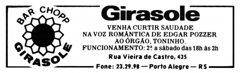 A vida social de Porto Alegre já foi cenário de casas noturnas para quase todos os gostos, idades e bolsos. Mas nenhuma chegou tão longe quanto o Girasole. Inaugurado em 20 de julho de 1970 pelo cantor Edgar Pozzer e a então esposa Salli Regina (1939-2022), o espaço localizado na loja térrea de um prédio residencial de quatro andares no número 435 do prolongamento da rua Vieira de Castro, bairro Santana, deteve marcas dignas de um imaginário livro dos recordes gaúchos, por funcionar de forma ininterrupta e com o mesmo dono durante exatos 47 anos, três meses e 11 dias, até pedir a conta em 31 de outubro de 2017.