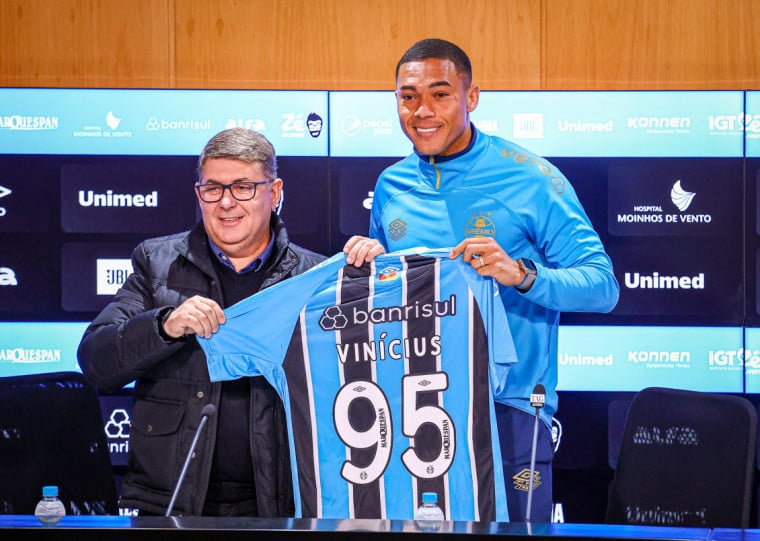 A tarde desta segunda-feira (28) foi de apresentação no Grêmio. O atacante Carlos Vinícius, ex-Fulham, da Inglaterra, falou pela primeira vez como atleta do Tricolor em coletiva de imprensa realizada no auditório da Arena. Nas primeiras palavras com a nova camisa, Vinicius - como prefere ser chamado - se mostrou ciente do atual momento que vive o time do técnico Mano Menezes e explicou os motivos que levaram-o a acertar com o clube gaúcho. O jogador de 31 anos assinou contrato até o fim de 2026.