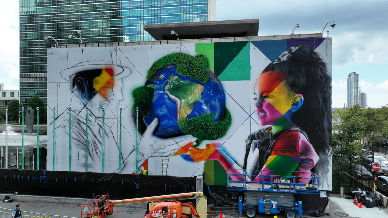 O muralista brasileiro Eduardo Kobra prepara um novo mural na fachada da ONU em Nova Iorque. O mural possui cerca de 336 metros quadrados e ilustra um pai entregando um planeta à filha, instigando uma reflexão sobre como queremos entregar o planeta e o futuro para as próximas gerações. A ação foi aprovada pelo Comitê da organização por reconhecer que o trabalho do artista é alinhado com os ideais das Nações Unidas. O paulista, de 47 anos, tem em suas obras temáticas como paz, diversidade e tolerância. O artista possui hoje 3 mil murais distribuídos por cerca de 35 países. A arte é exposta durante a Semana de Alto Nível da 77ª Assembleia Geral da ONU, evento que reúne líderes de todo o mundo, entre os dias 19 a 26 de setembro.