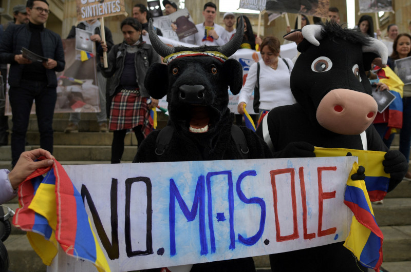 Ativistas pelos direitos dos animais realizaram um protesto na praça Bolívar, em Bogotá, na Colômbia, nesta terça-feira (18). Os colombianos se manifestaram contra as touradas e brigas de galo. Em uma faixa que carregavam, podia se ler "não mais olé" (foto), em referência ao som que a arena faz quando o toureiro desvia do animal. Em junho deste ano, quatro pessoas morreram e centenas ficaram feridas após a queda de uma arquibancada durante uma tourada no centro da Colômbia. O acidente aconteceu durante a tradicional corraleja, quando o público é incentivado a entrar na arena para interagir com os animais; a ação faz parte da popular festa de São Pedro. Na ocasião, o presidente da Colômbia, Gustavo Petro, fez uma publicação no Twitter na qual fez um apelo para que os prefeitos do país não permitissem "mais espetáculos com a morte de pessoas e animais".
