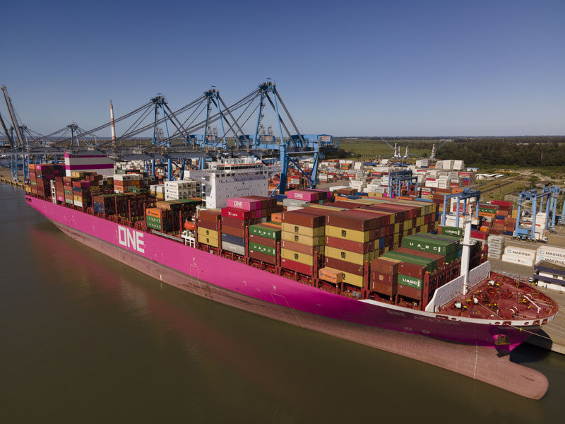 O porto de Rio Grande tornou-se, na madrugada desta quarta-feira (2), uma das paradas do ONE Amazon (foto), um dos maiores cargueiros a navegar pela costa brasileira. Com 330 metros de comprimento e 48 metros de largura, a embarcação foi construída em agosto de 2022, em Hong Kong. Saindo de seu porto inicial no dia 10 de setembro, em Busan, na Coreia do Sul, o barco passou pelos portos de Buenos Aires, na Argentina, e Montevideo, no Uruguai, antes de desembarcar na cidade portuária do Sul do RS. A cor magenta do navio chama atenção, e é característica das embarcações da ONE. Com a chegada do navio aos portos da América Latina, em outubro e início de novembro, a cor similar ao rosa reforça a campanha mundial Outubro Rosa, de conscientização à prevenção ao câncer de mama. O Terminal de Containers (Tecon) do Porto de Rio Grande vai movimentar ao todo 1.439 contêineres.