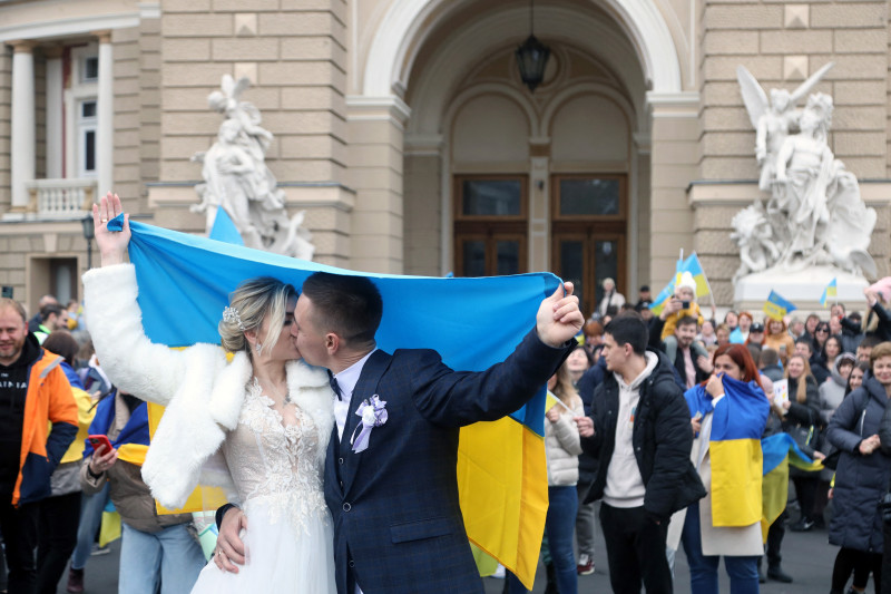 Centenas de pessoas se reuniram em diferentes partes de Odessa neste sábado (12) para celebrar a retomada da sua cidade natal, Kherson. “Kherson é nossa”, declarou o presidente ucraniano Volodymyr Zelensky depois que as tropas russas se retiraram da cidade. Um dos pontos de comemoração foi em frente ao Teatro de Ópera e Balé de Odesa, onde as pessoas se concentraram e dois moradores de Kherson recém-casados se beijaram enquanto seguravam uma bandeira ucraniana (foto). A cidade portuária de Kherson havia sido tomada pelos russos nos primeiros dias da guerra contra a Ucrânia, em 2 de março, e foi a mais importante cidade ocupada até aqui pelos russos. A capital da província homônima havia sido anexada pelo governo de Vladimir Putin em 30 de setembro. Os Estados Unidos consideraram a saída dos russos uma “extraordinária vitória”