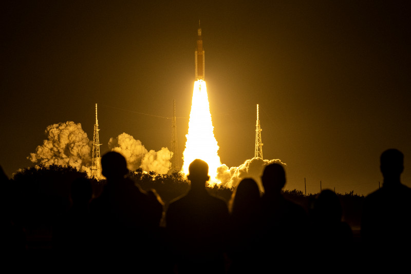A Nasa lançou, na madrugada desta quarta-feira (16), a missão Artemis 1, primeiro voo do foguete SLS (Space Launch System) com a cápsula Orion, destinada a levar humanos de volta à Lua. O foguete foi lançado em uma explosão de luzes, às 3h47min (de Brasília). O SLS, de 32 andares, decolou do Kennedy Space Center, e uma multidão de espectadores aplaudiu e gritou durante o lançamento. A decolagem ocorreu na terceira tentativa de lançamento do foguete, após 10 semanas marcadas por vários contratempos técnicos, furacões e duas excursões levando a espaçonave de seu hangar para a plataforma de lançamento. A missão envolve levar a cápsula até uma órbita retrógrada distante ao redor da Lua, onde ficará por volta de uma semana, antes de retornar à Terra. A previsão é que o retorno aconteça no dia 11 de dezembro.