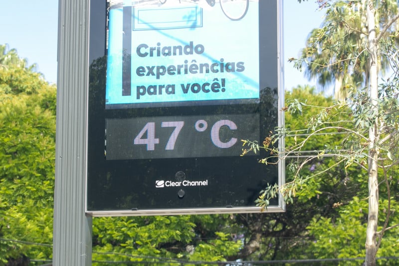 Uma massa de ar quente ganhou intensidade no Rio Grande do Sul nesta semana, chegando a temperaturas de quase 50°C em algumas regiões, como a equipe do Jornal do Comércio registrou nesta quinta-feira (foto) em um termômetro de rua de Porto Alegre. No entanto, calor intenso associado à chegada de umidade pelo Oeste e Sul poderá formar nuvens carregadas com chuva e temporais muito isolados, sobretudo, em cidades da Metade Oeste e Sul nos próximos sete dias. Com as chuvas expressivas que estão previstas, principalmente para a próxima segunda e terça-feira, haverá o deslocamento de uma frente fria em todo o Estado. Os volumes previstos deverão oscilar entre 15mm e 20mm na maioria das regiões.