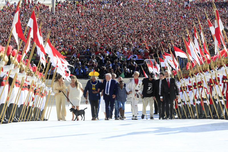 Eleito para exercer seu terceiro mandato, o presidente Luís Inácio Lula da Silva tomou posse no domingo, 1º de janeiro. A cerimônia foi marcada pela ausência do antecessor de Lula, o ex-presidente Jair Bolsonaro, que viajou para os Estados Unidos antes do ano novo. Devido a isso, o tradicional momento de passagem da faixa presidencial precisou ser feito de maneira inusitada. Lula recebeu a faixa da mão de 8 cidadãos brasileiros, cada um representante de um grupo social: o estudante e nadador Francisco, a catadora de resíduos Aline, o influencer e ativista Ivan, o DJ e metalúrgico Weslley, a cozinheira Jucimara, o artesão Flávio Pereira, o Cacique Raoni e o professor Murilo. Os cidadãos subiram a rampa do Palácio do Planalto juntamente com o presidente, o vice, Geraldo Alckmin, a primeira e segunda dama, Janja Silva e Lu Alckmin, e a mascote do casal Lula da Silva, a cadelinha Resistência.