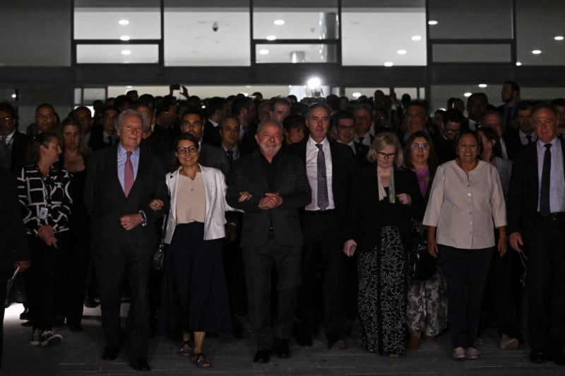 Após reunião com governadores e vice-governadores de 27 estados, o presidente Luiz Inácio Lula da Silva (PT) saiu em caminhada do Palácio do Planalto ao Supremo Tribunal Federal (STF) na noite desta segunda-feira (8).Também participaram da reunião ministros do STF, entre eles a presidente da Corte, a ministra Rosa Weber. Os representantes atravessaram a Praças dos Três Poderes à pé um dia após a ação criminosa de bolsonaristas radicais às instituições no Distrito Federal. No meio da Praça, o presidente falou com a imprensa e disse que o governo "não dará trégua" até descobrir quem financiou os atos terroristas na capital federal. "O que eles querem é golpe, e golpe não vai ter", completou Lula. As forças de segurança brasileiras bloquearam a área ao redor do Congresso, do Planalto e do STF na segunda. Lula optou por despachar do Planalto, mesmo com o prédio ainda destruído e passando por trabalho de limpeza e vistoria.