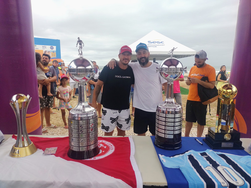 A presença de Douglas e Índio, dois ídolos da dupla GreNal, agitou o calçadão da praia de Tramandaí na manhã deste domingo, 15 de janeiro. Os craques tiveram encontro com fãs, que puderam tirar fotos e conversar com os atletas, além de ver de perto troféus que eles conquistaram na carreira. Após, os dois participaram de um jogo festivo de futebol de areia, o Desafio dos Campeões, com convidados. A ação foi promovida pela plataforma de apostas esportivas Mrjack.bet, em parceria com o Sesc/RS, e ocorreu junto à Casa de Praia do Sesc Tramandaí como parte da programação do Estação Verão Sesc. Ídolo do Internacional, Índio diz-se alegre com a oportunidade do contato direto com os torcedores. "É pra gente retribuir o carinho do pessoal", destacou, antes de entrar em campo. Douglas complementou: "O que a gente plantou, a gente está colhendo agora. O carinho dessa galera não tem preço", ressaltou. A dupla, que era rival em campo no passado, esbanjou simpatia durante o evento. No jogo, o time de Índio foi o que levou a melhor, vencendo por sete a três.